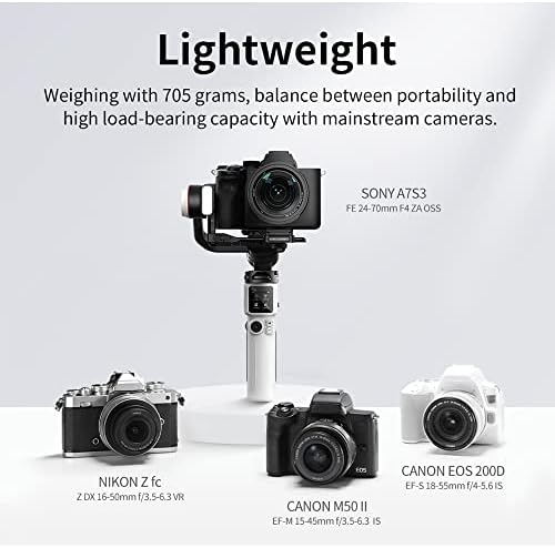 Sony α7M2, α7R2, α7S2, α7M3, α7R3, α7S3, α7R4, α7C, α7C, α6600, α6500, α6400, α6300, α6100, α6100, ZV-E10, DSC-RX100M5A, DSC-RX100M5, DSC-RX100M6, DSC-RX100M7, DSC-WX350, DSC-HX90, ZV-1 Canon EOS R, EOS RP, EOS R5, EOS R6, EOS M50, M50 Mark II, M50 Mark II, EOS M6 Mark Ⅱ, EOS 200D, PowerShot G1X Mark II, PowerShot G7X Mark III, PowerShot SX720 HS Nikon Z50, Z5, Z6, Z6 II, Z7, Z7 II, Zfc FUJIFILM X-T20, X-A7, X-T2, X-T2, X-T3, X-T4, X-S10, X-S10, X-T30 Panasonic DC-G100, DMC-GH4, DMC-GH5, DMC-GH5S, DMC-GH5S, LX100M2, DMC-LX10, DMC-ZS110 SIGMA fp Warm Note For more Camera Lens Supported List and Camera Control List, please check and download the Compatibility List or visit Zhiyun official for the latest information.