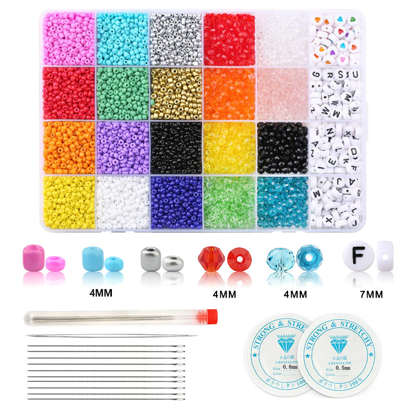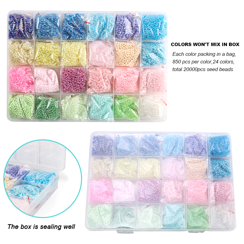 Glass beads set include 20000 pcs 2mm various colors seed beads with storage box, 2 rolls clear elastic thread, 100 pcs jump rings, 20 pcs claw clasps, 1 pcs scissors,2 pcs needles,1 pcs tweezer.