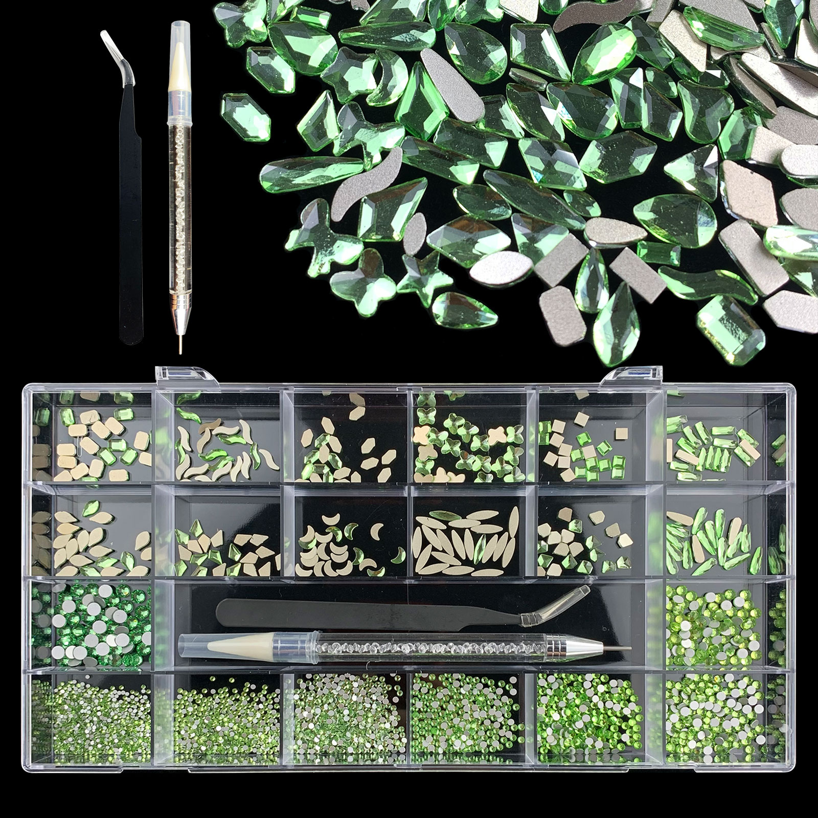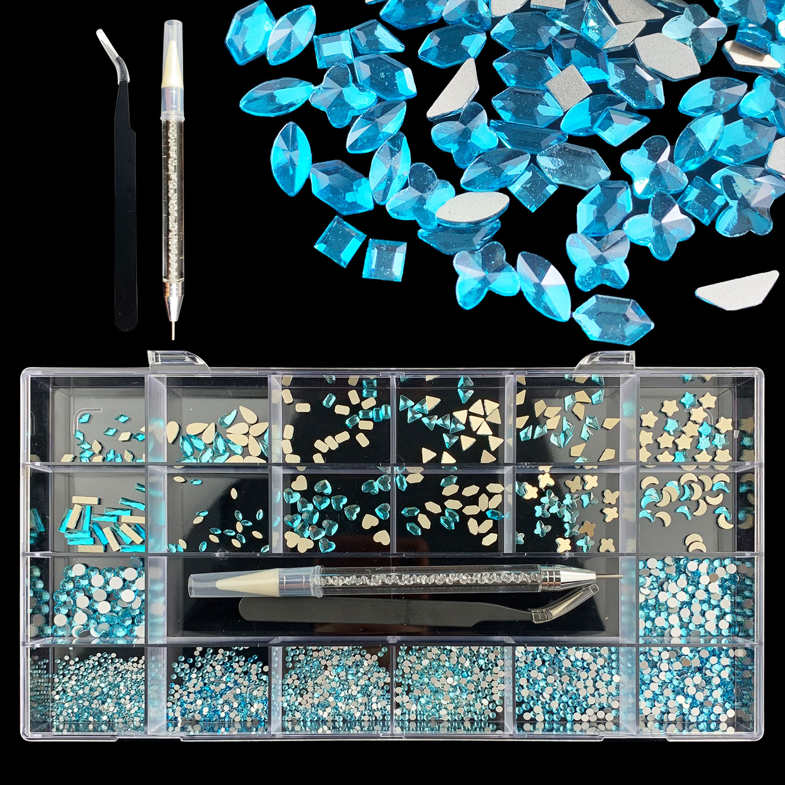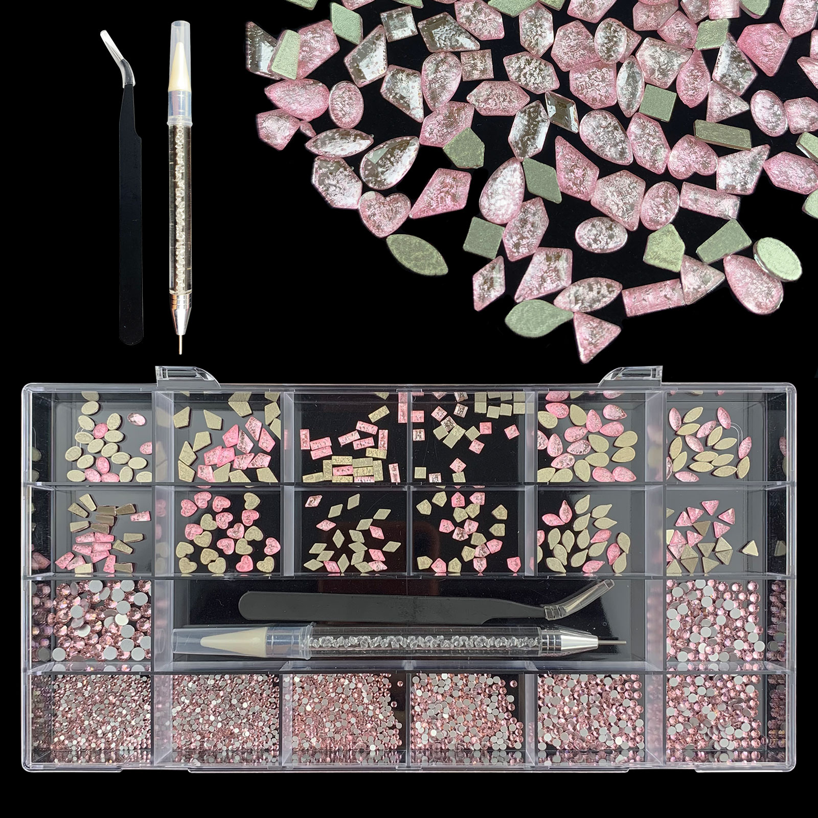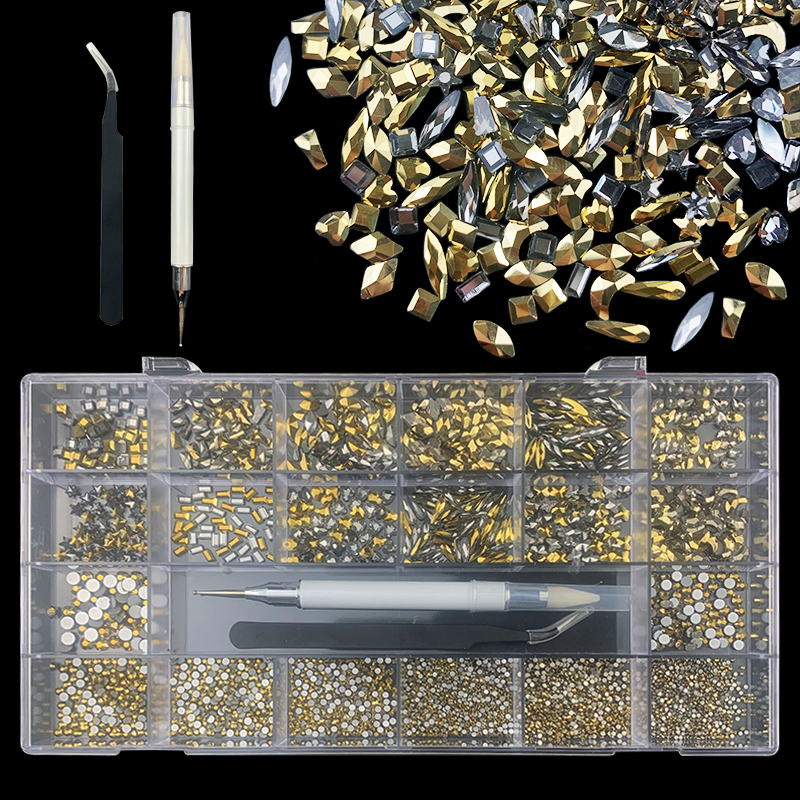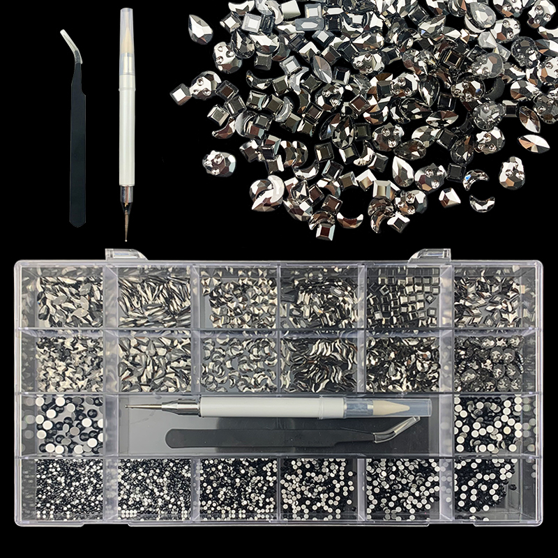2). 2740pcs Rhinestone set: 240pcs(20x12) k9 crystal glass rhinestones, 2500pcs mix sizes round rhinestones,1pcs wax pen(Crystal or white), 1pcs tweezers for free