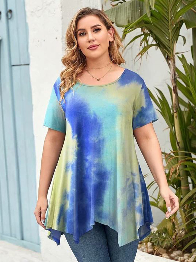 5XL 6XL Plus Size Women Clothing Summer Short Sleeve Tie Dye Print Casual Tee Shirt Peplum Tops Irregular Long Blouse