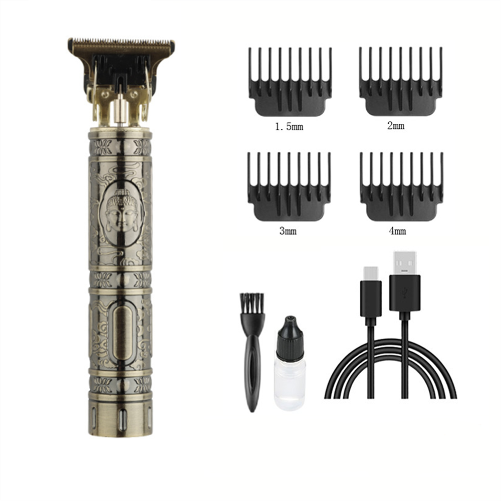 Accessories: USB charging cable, limit comb, cleaning brush, manual.