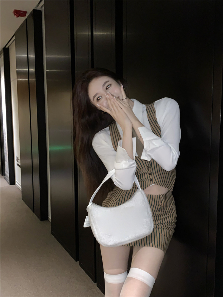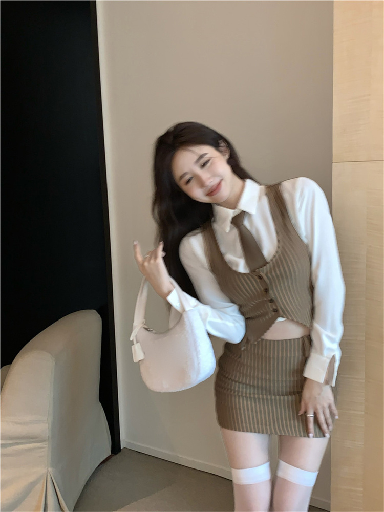 American Retro 3pcs Suit Women V-neck Button Up Vest + Shirt Tie + Mini Skirt Spring Girl Knitted
