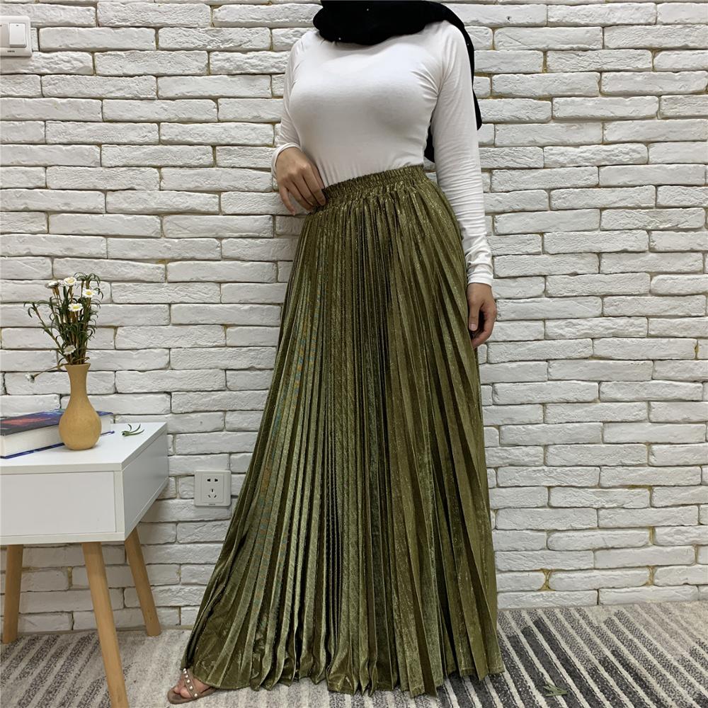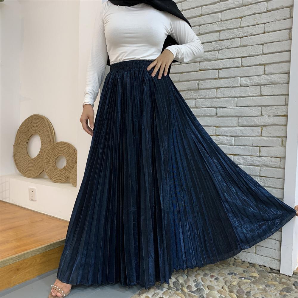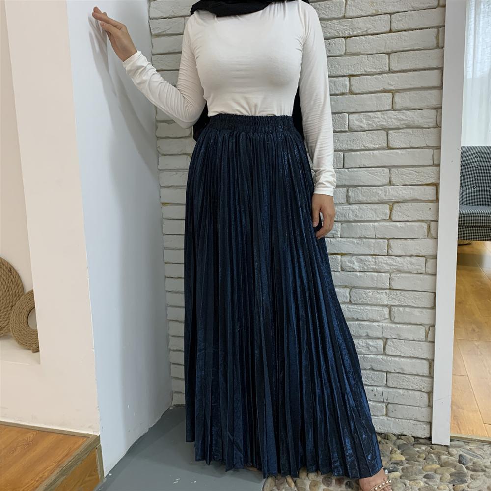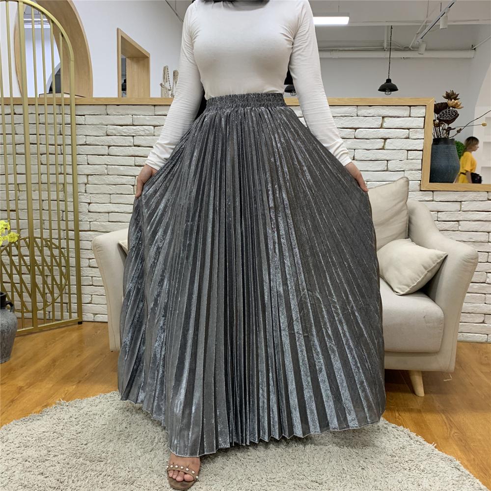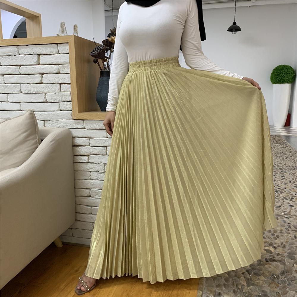 Arrivals Metallic Pleated Maxi A-Line Autumn Winter Long Skirt Solid Satin Pleated Maxi Skirt Muslim Women's Islamic Turkey