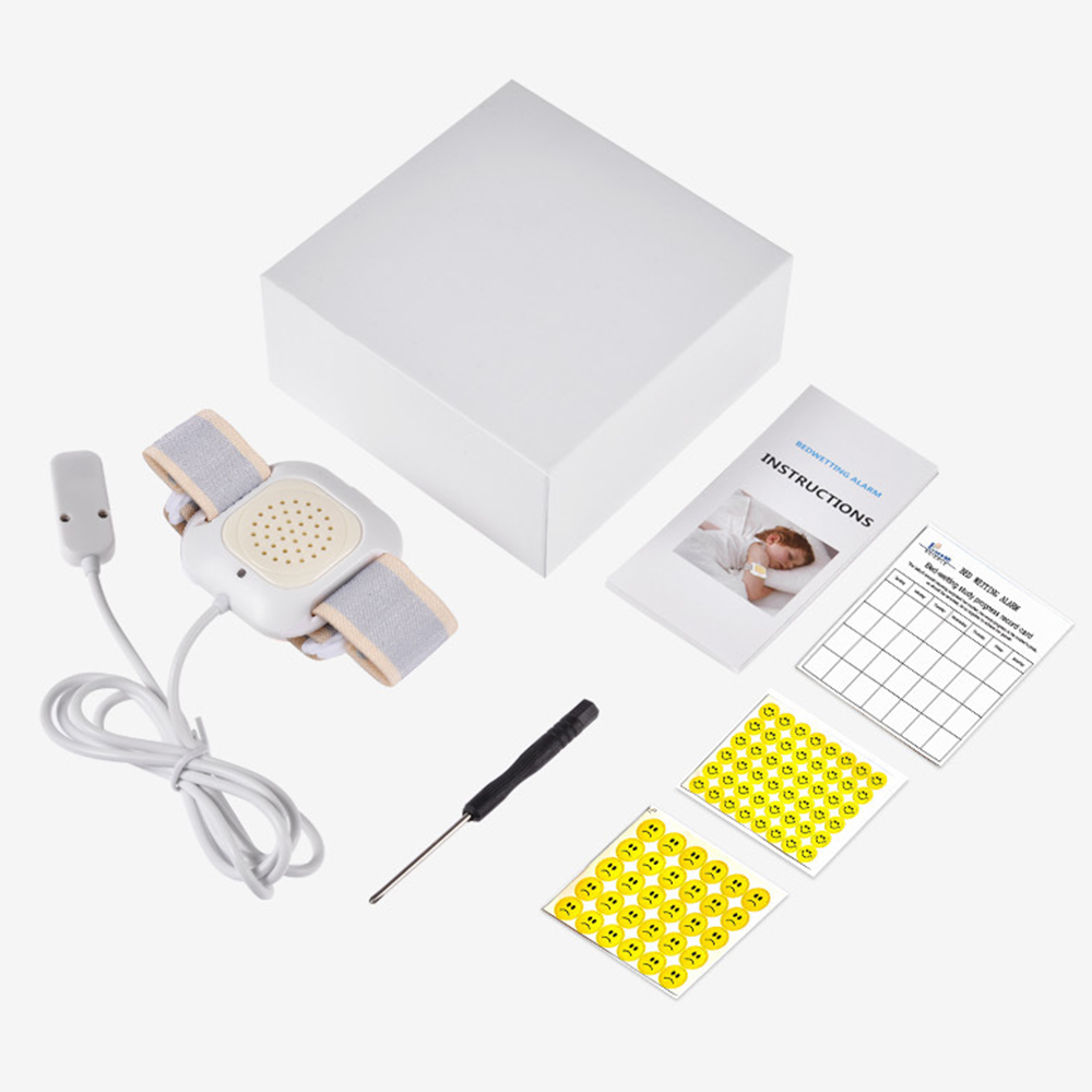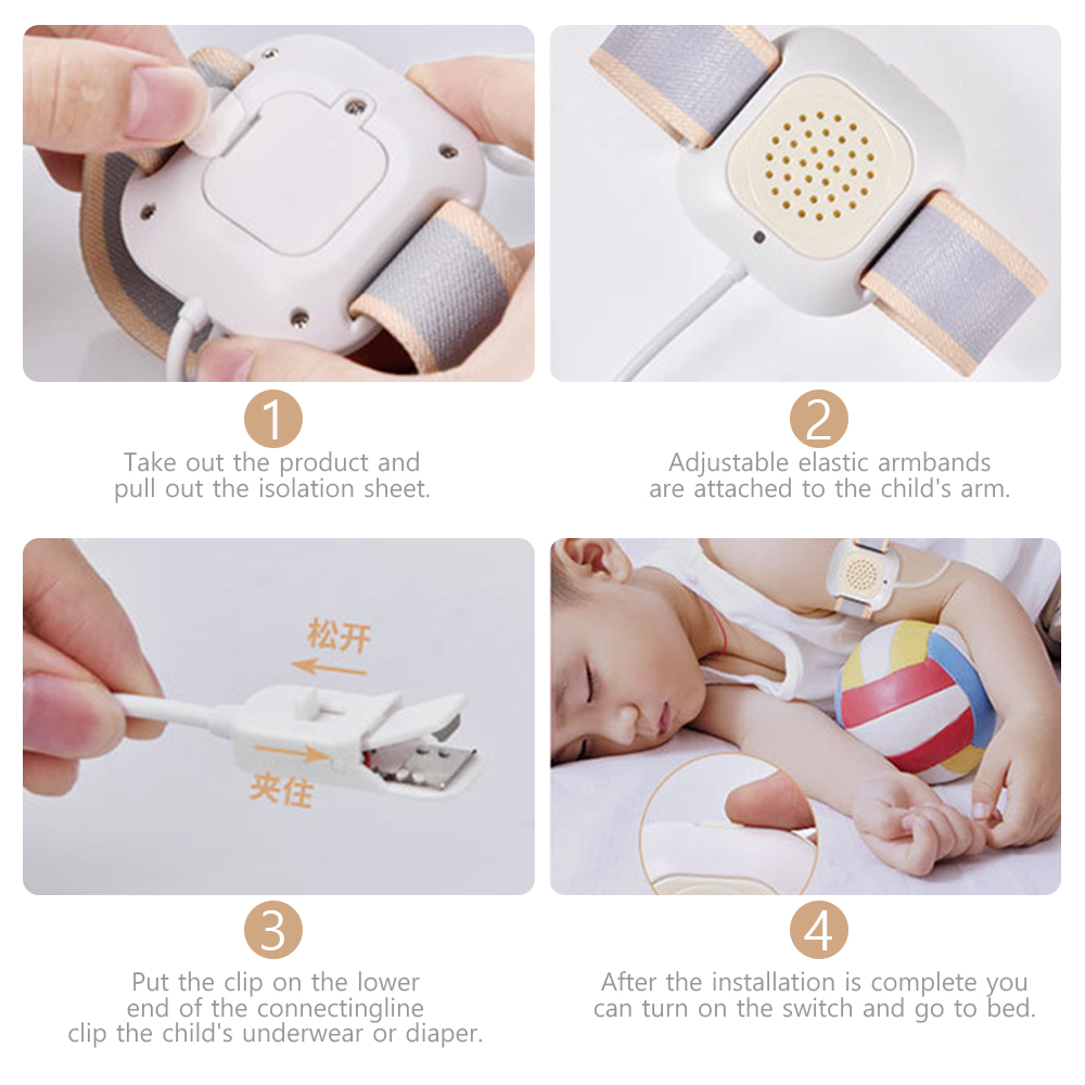 This is a very user-friendly design product with a bedwetting reminder function for infants and young children. When the bedwetting occurs, a sound and vibration signal are emitted, so as to remind adults to know and take measures that are beneficial to the baby's health in time. The reminder device has high humidity sensitivity, and the response is fast and sensitive. The product is compact and easy to wear, just clamp the control head in a position where it can be detected. With it, adults can easily find out the dryness and wetness of baby's diapers
