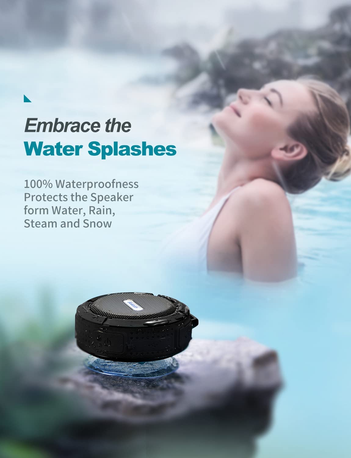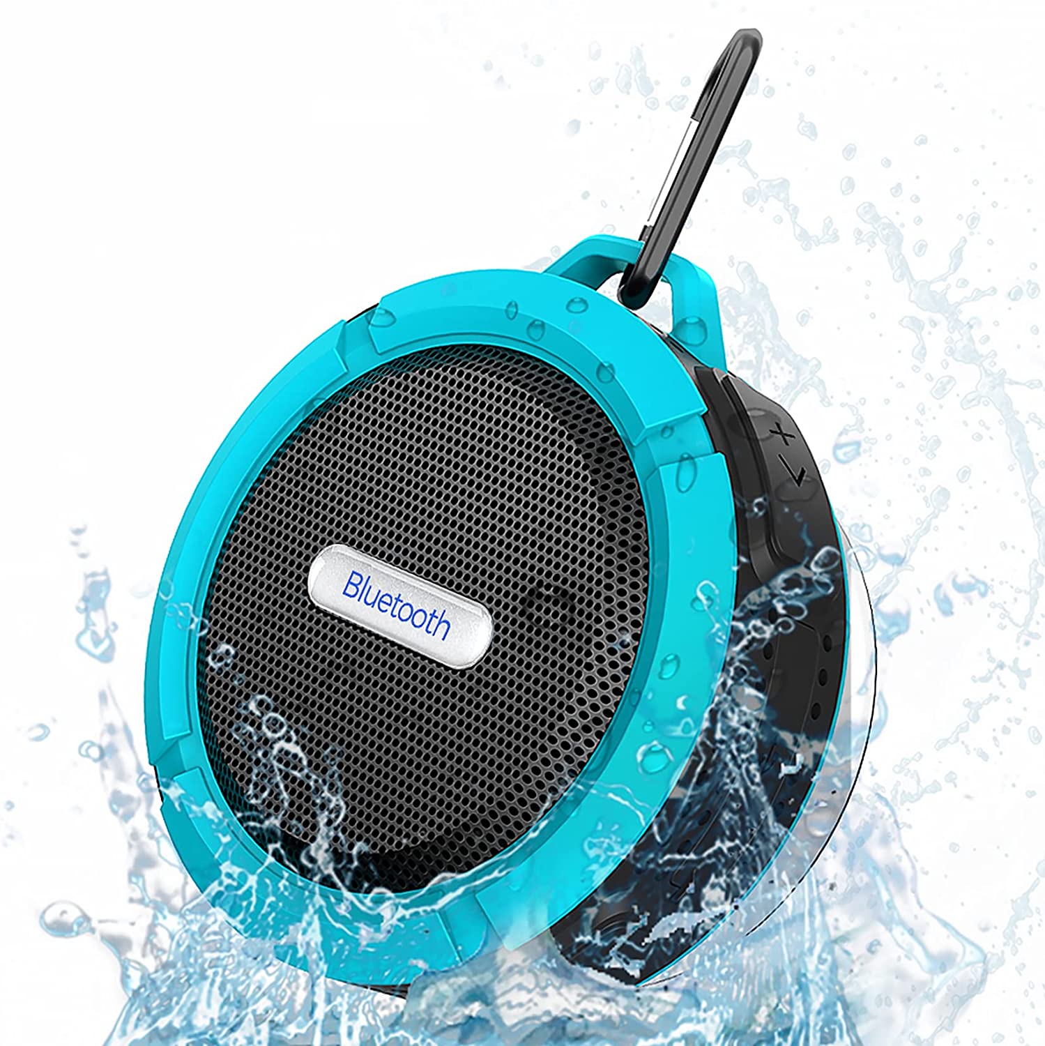 Portable & Lightweight - Equipped with a suction cup and the detachable metal hook, it is easy to attach in shower wall, tiles and mirrors, and you can also use the hook to hang the portable speaker on the backpack when hiking.