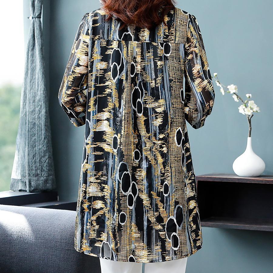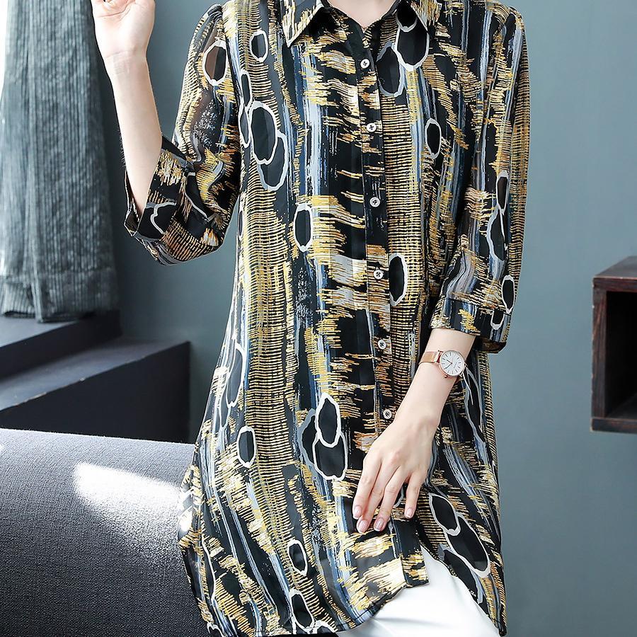 Casual Vintage Print Button Long Shirt Summer Office Lady Polo-Neck Three Quarter Sleeve Loose Tops Ladies Clothing