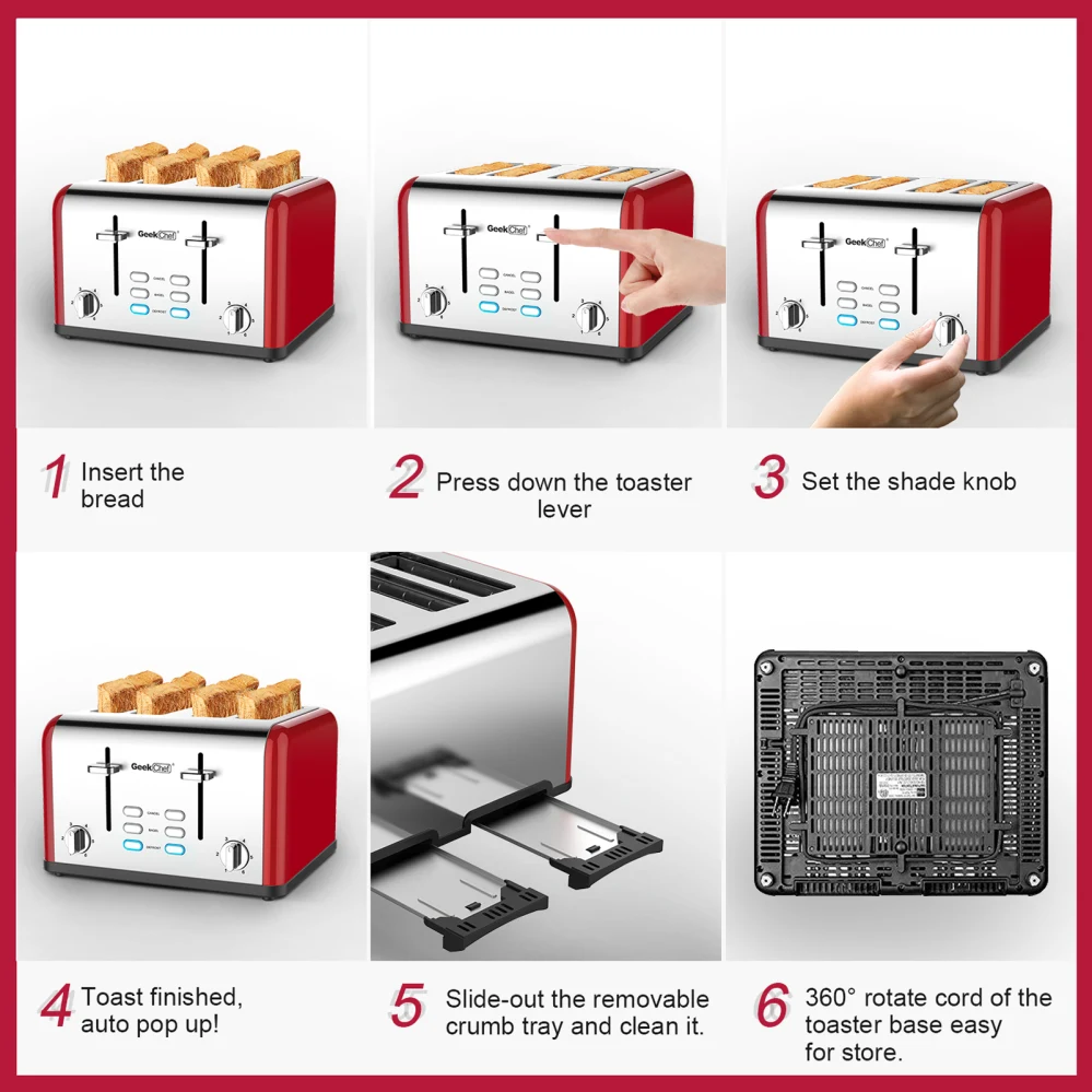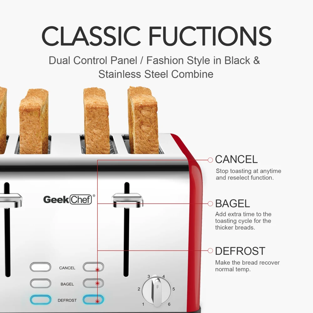 (Don't on Amazon) Toaster 4 slices, geek chef stainless steel extra-wide slot toaster, dual control panel with bagel/defros