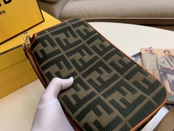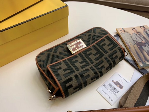 Iconic Baguette bag in medium size, with flap and FF fastening with magnetic clasp. Lining with zip pocket. Can be carried by hand or worn cross-body thanks to the detachable shoulder strap. Made of blue denim with embroidered FF motif. Finished with natural-colour leather details. Pequin webbing shoulder strap.
