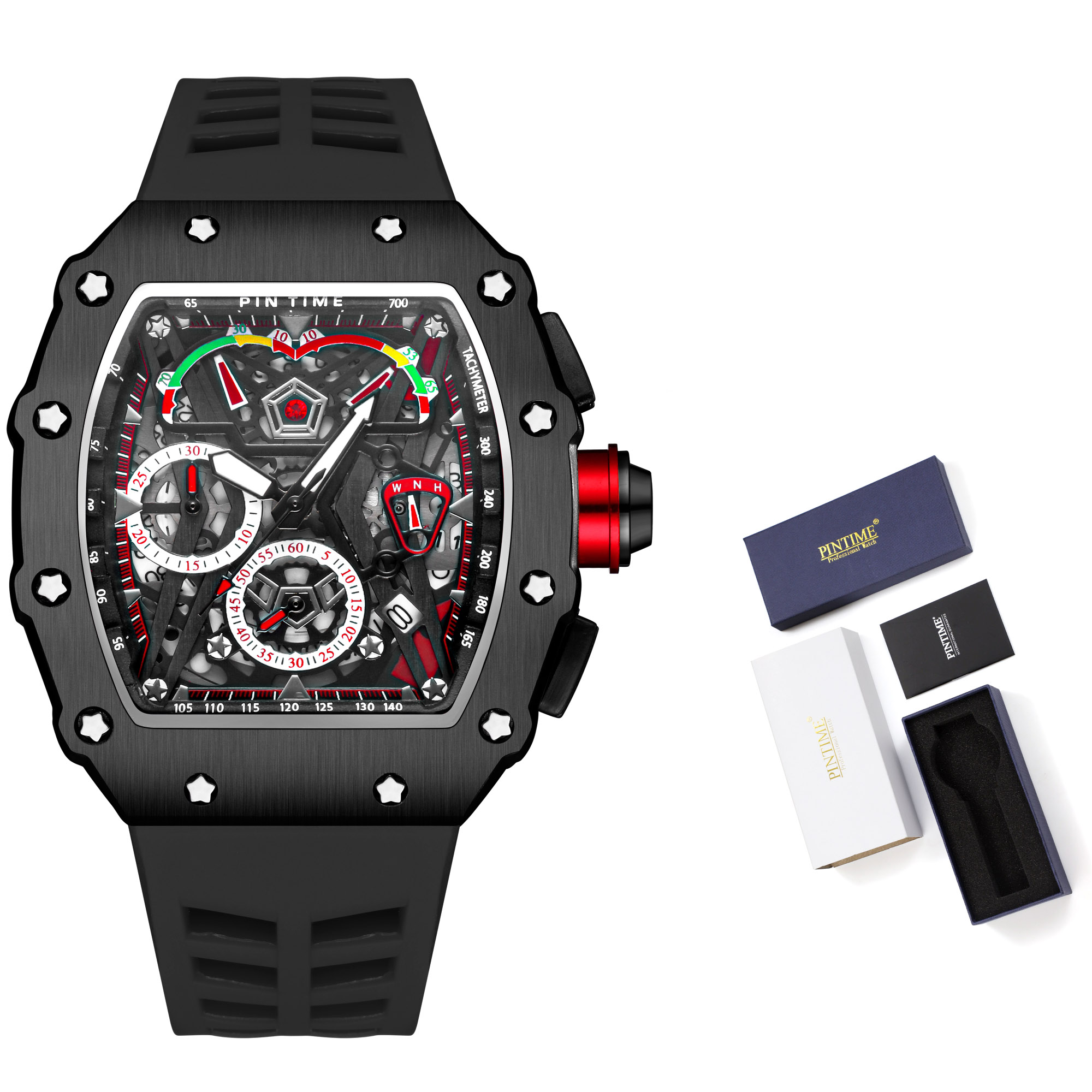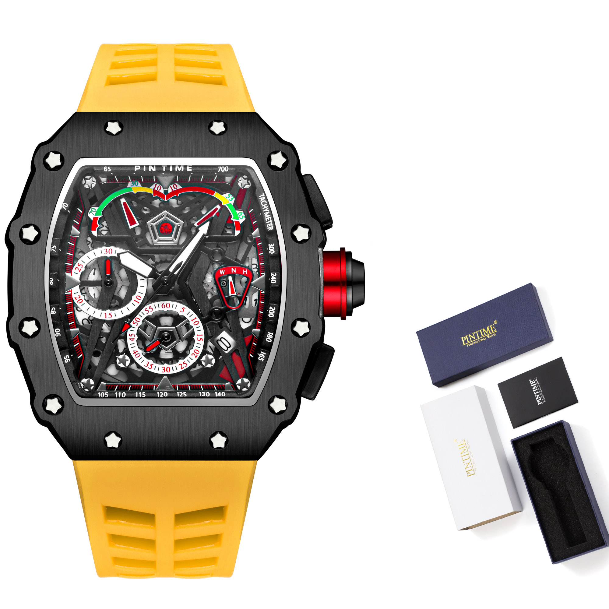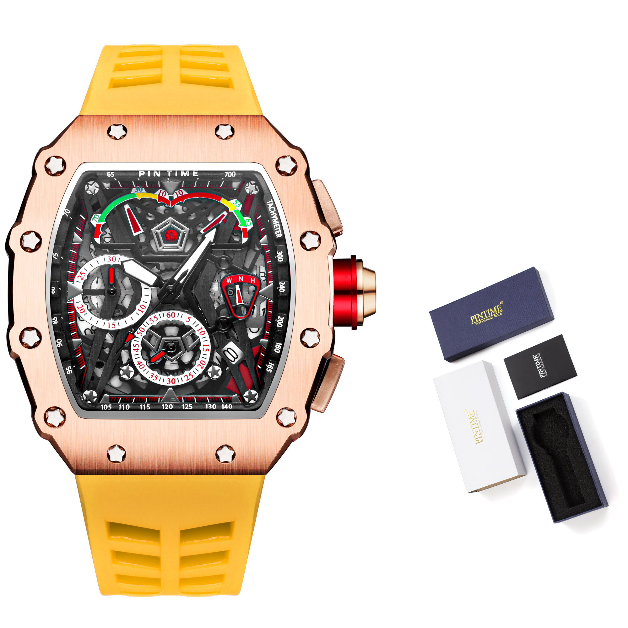 PINTIME Casual Men Sport Rose Gold Watch Chronograph Function Stopwatch Rubber Strap Auto Date Male Wristwatch
