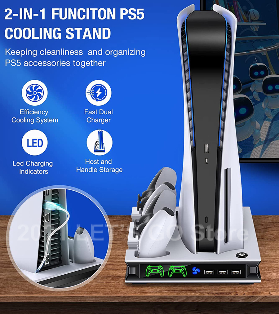 【Multi-functional Design & Power Supply Devices】This PS5 cooling & charging stand more tight design for for PS5 Digital Edition and Disc Edition Consoles.This PS5 cooling stand with efficient cooling fans and dual PS5 controller charger station,4 x type-c magnetic dongies , 3x 2.0 USB ports, 2xLED charging indicators, screw storage, 1 fixed USB cable,It's a must have PS5 accessories for ps5 charging station to safely store ps5 controller and display your Ps5 console.
