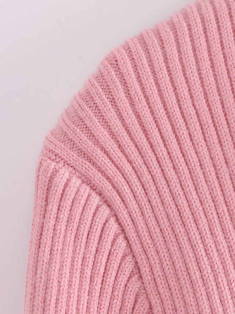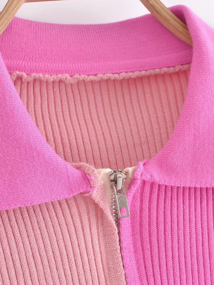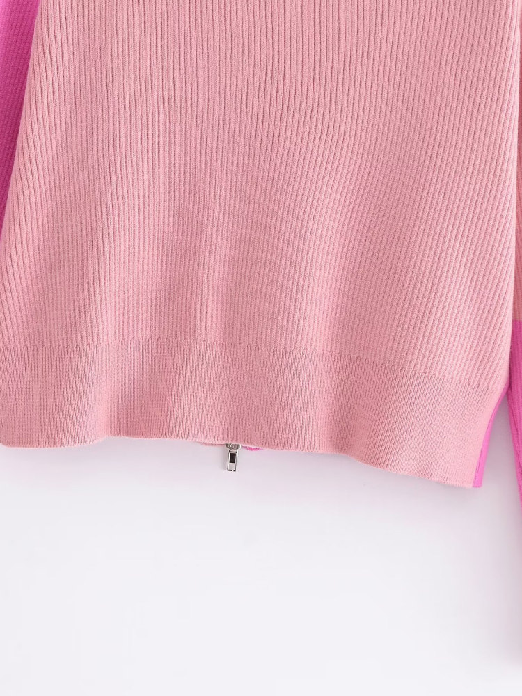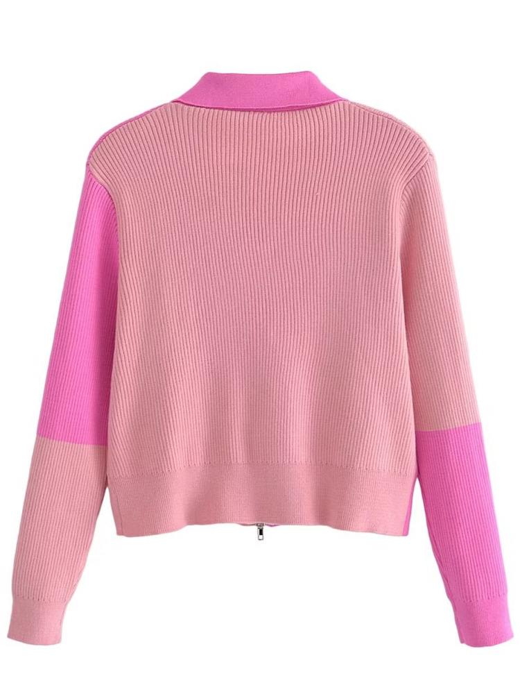 PUWD Women Pink Turndown Collar Contrast Color Cardigan 2022 Autumn Winter Fashion Girls Casual Female Long Sleeve Zipper Sweater