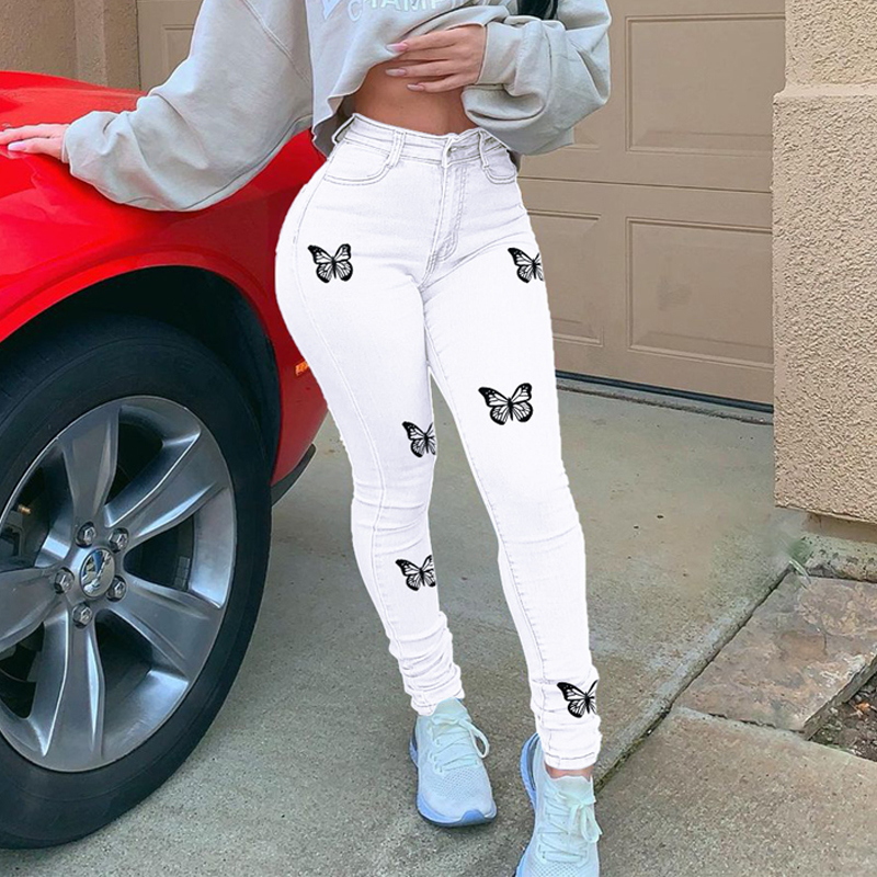 Printed Blue Jeans Women High Waist Skinny Denim Trousers Summer Thin Denim Pencil Pants Office Lady Casual Pants