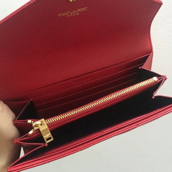Indulge in this Saint Laurent large monogram wallet wallet to add the Parisian label’s hard-edged opulence to your ensemble. Crafted from grain de poudre embossed leather, this design features multiple card slots and a zipped interior compartment, perfect for securely storing your valuables. The chevron patterned luxurious quilting is punctuated by the iconic ‘YSL’ logo, reflecting the label’s timeless appeal.