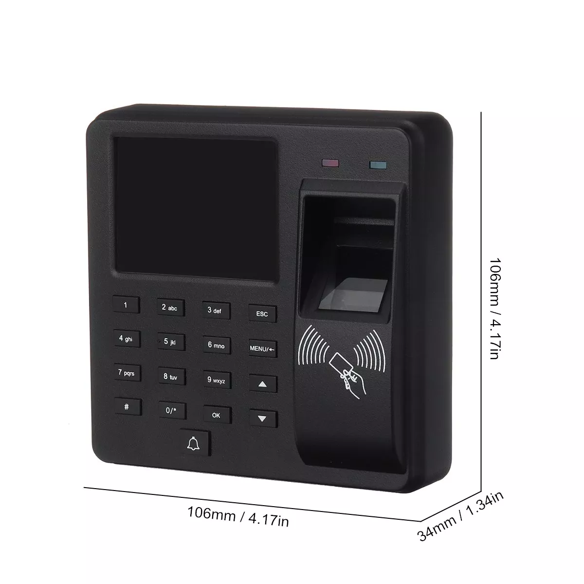 Item Specifics: Material: ABS Color: Black Voltage: DC 12V Working Current: 150mA Working Frequency: 500DPI (Khz) Installation: Wall Mounted Fingerprint Capacity: 1000 Recording Capacity: 100,000 Interface: WG26 / WG34 (Input / Output) Features: Alarm Function / USB Flash Drive Download Identification Way: Fingerprint + ID Card + Password Operating Temperature: 0-60℃ / 32-140°F Dimension: 106 x 106 x 34 mm / 4.17 x 4.17 x 1.34 in (approx.) Package Included: 1 x Fingerprint Time Attendance 2 x Cable 1 x Screw Kit 1 x Instruction (other decorations NOT included)