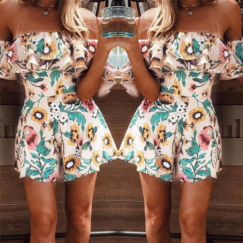 Summer Women Short Off Shoulder Jumpsuits Overall Lady Floral Printed Playsuit Beach Holiday Wear Ruffle Romper