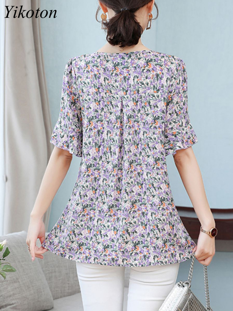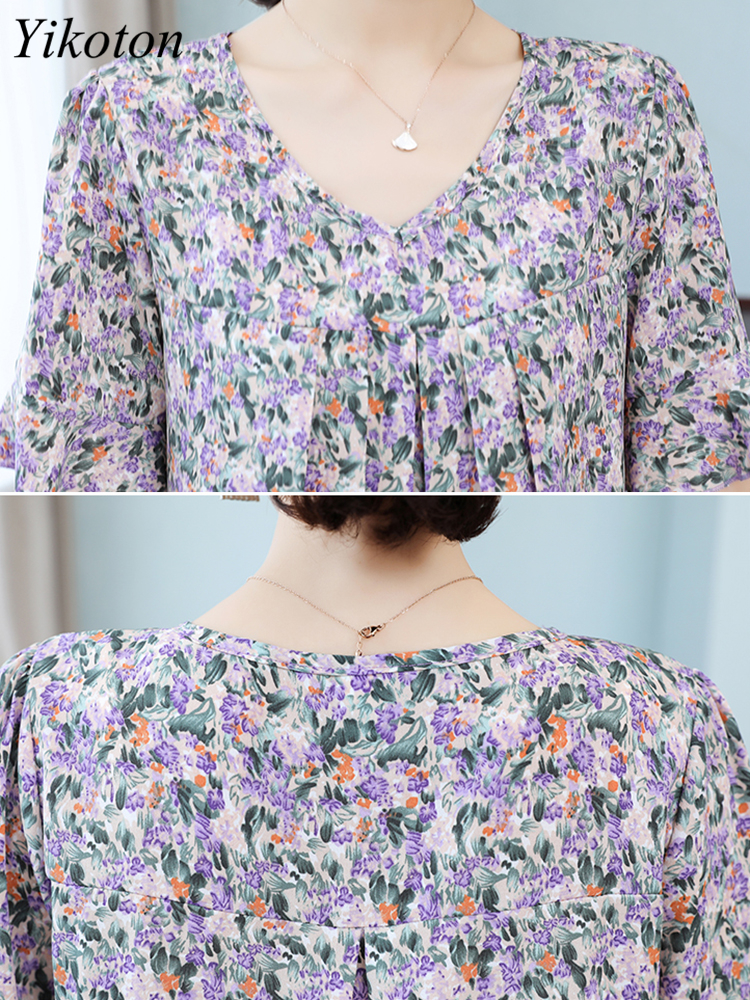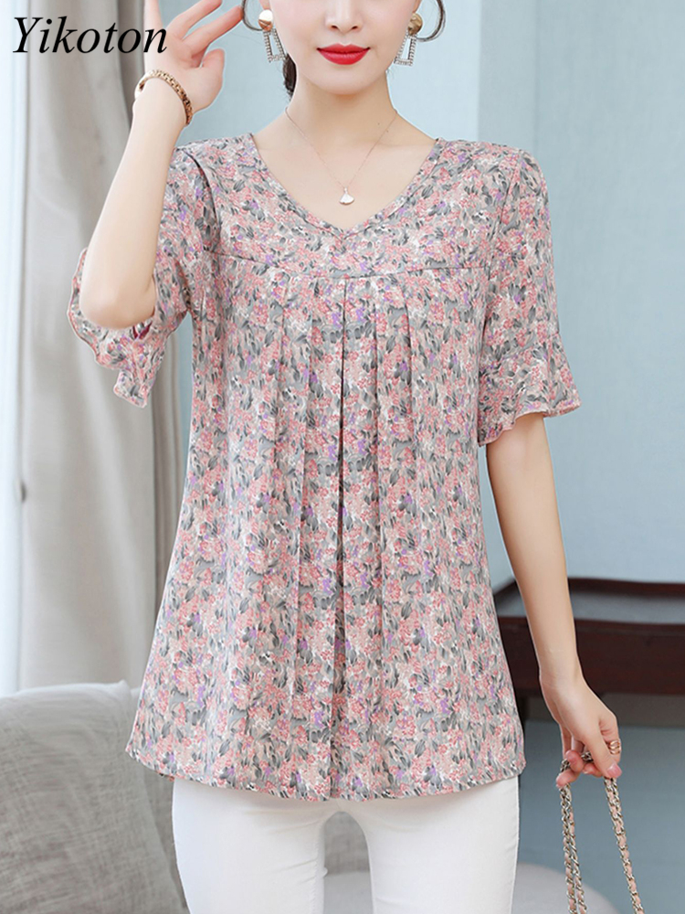 Summer Women's Tops Short Sleeved Ladies Blouse V-Neck Large Size Loose Top Chiffon Shirt Folds Casual Print Blouses Blusas