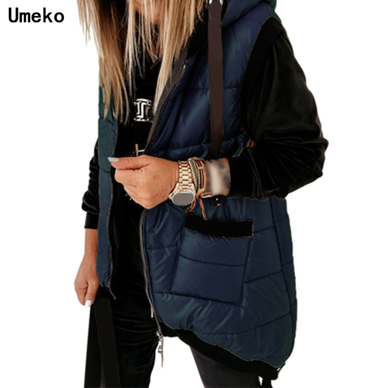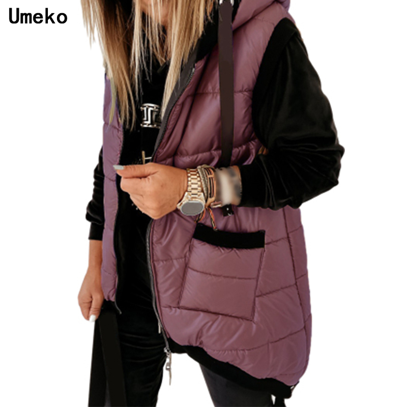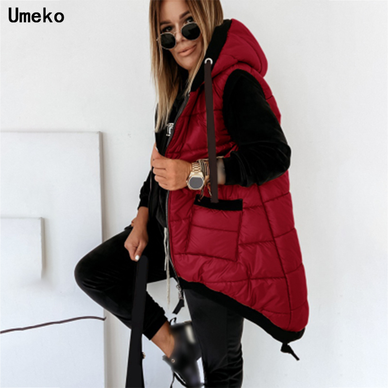 Umeko Women's Long Vest Hooded Autumn Winter Pockets Casual Ladies Sleeveless Jacket Solid Slim Waistcoat for Female