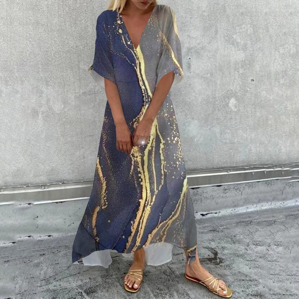 V-Neck Half Sleeve Large Hem Elegant Dress Vivid Flower Printing Ladies Loose Maxi Dress Female Clothing