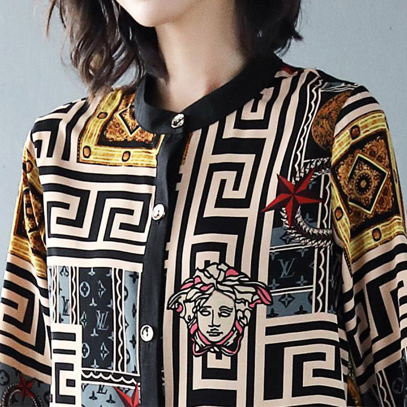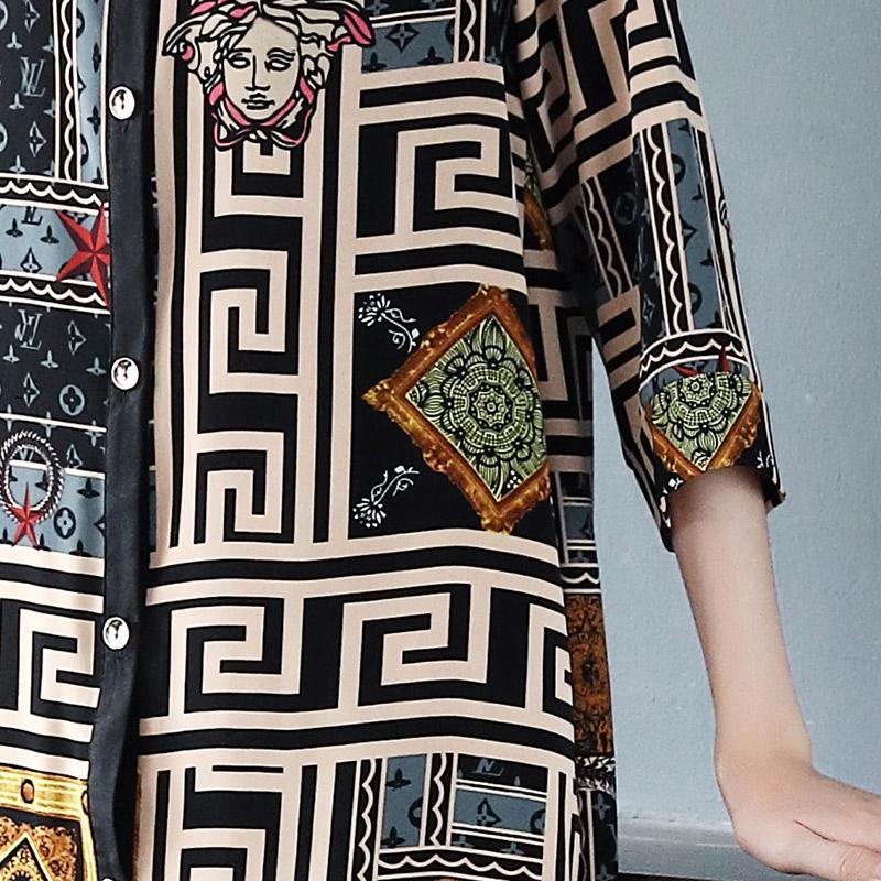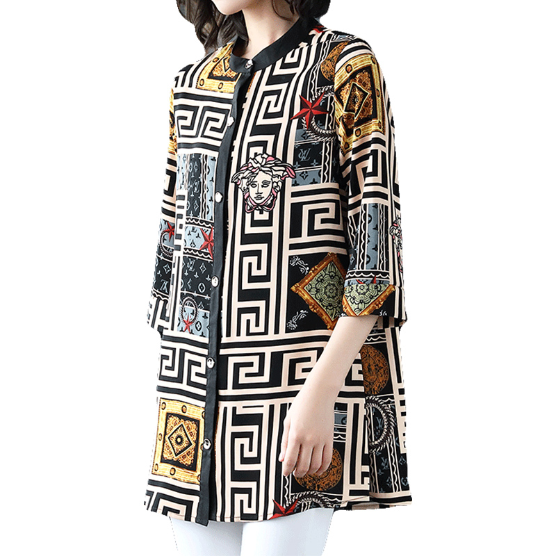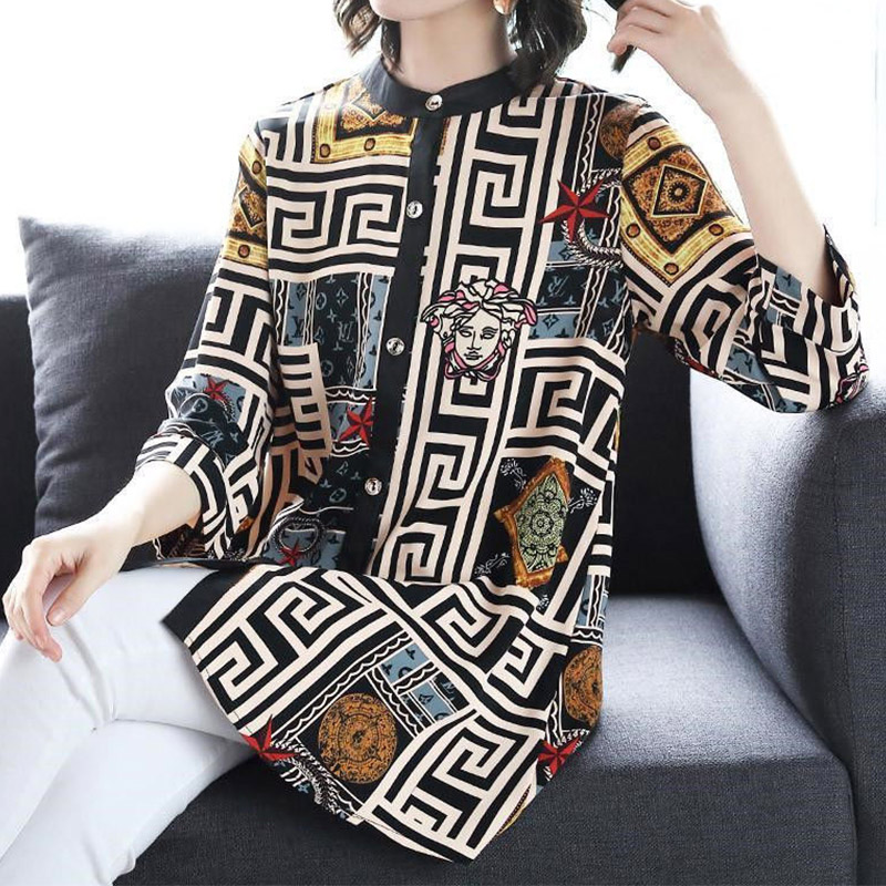 Vintage Casual Printing Button Long Shirt Summer Autumn Street Style O-Neck Three Quarter Sleeve Loose Tops Ladies Clothing
