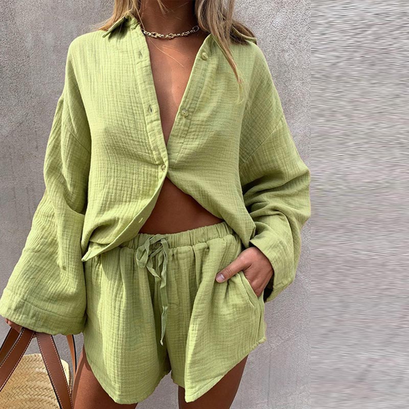 Women Casual Tracksuit Shorts Set Summer Long Sleeve Shirt Tops And Mini Drawstring Shorts Suit Lounge Wear Two Piece Set