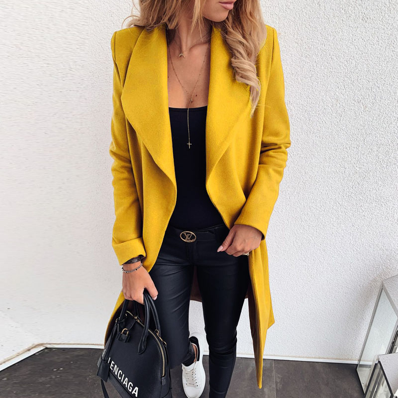 Women Elegant Turn-down Collar Belt Woolen Coat Autumn Winter Casual Slim Long Coats Office Ladies Solid Long Sleeve Open Stitch