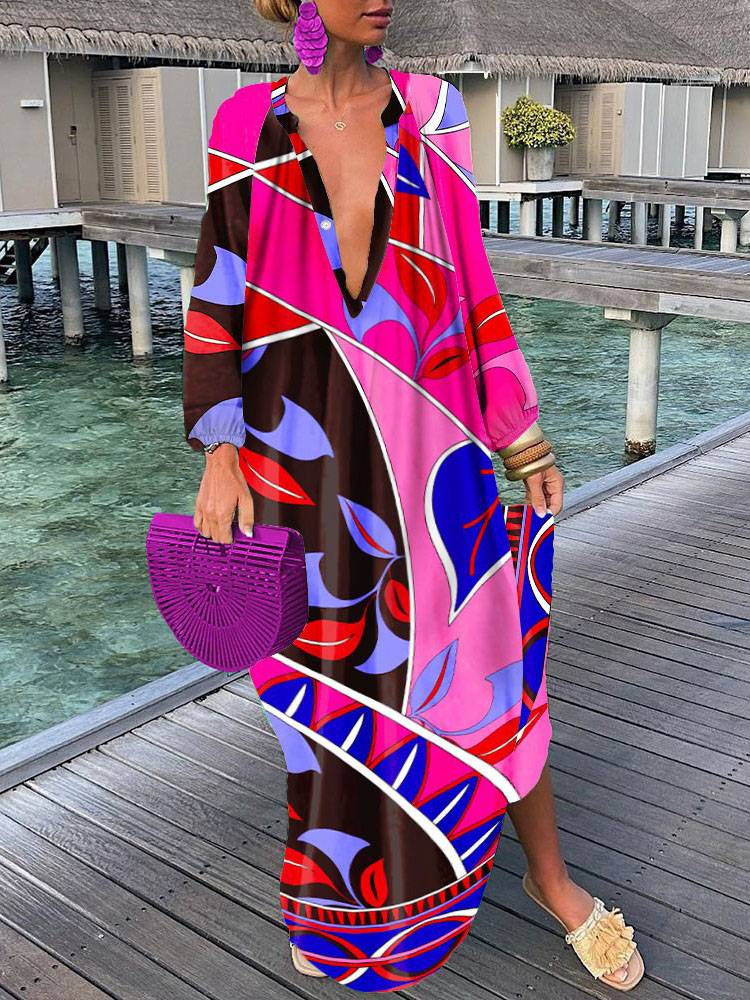 Women Elegant V Neck Loose Party Dress Lady Retro Printing Long Sleeve Holiday Dress Autumn Casual Femme Dress Streetwear