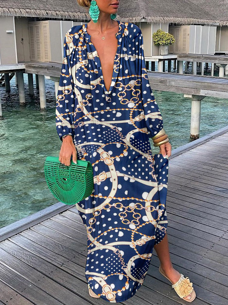 Women Elegant V Neck Loose Party Dress Lady Retro Printing Long Sleeve Holiday Dress Autumn Casual Femme Dress Streetwear