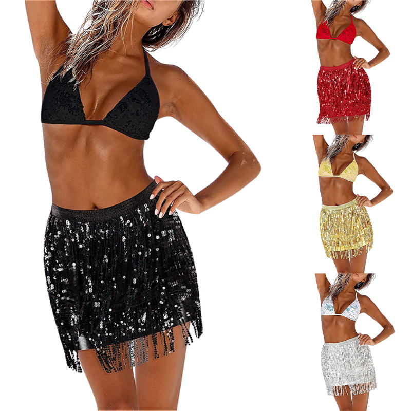 Women Sequined Fringe Skirt Glitters Elastic Waist Miniskirt Mini Skirt for Dance Rave Party Black/Silver/Gold/Red