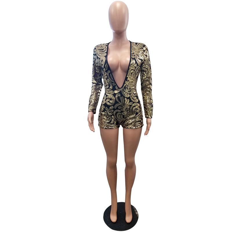 Women Sexy Nightclub Playsuit Bodycon Jumpsuit Deep V Neck Long Sleeve Rompers Sequins Bodysuit Women Party Jumpsuit