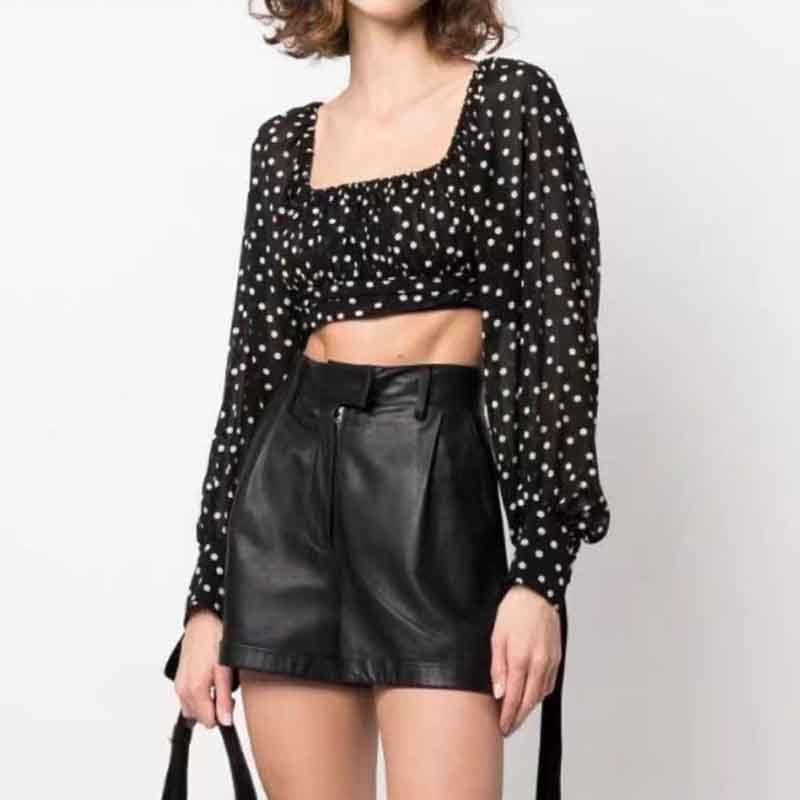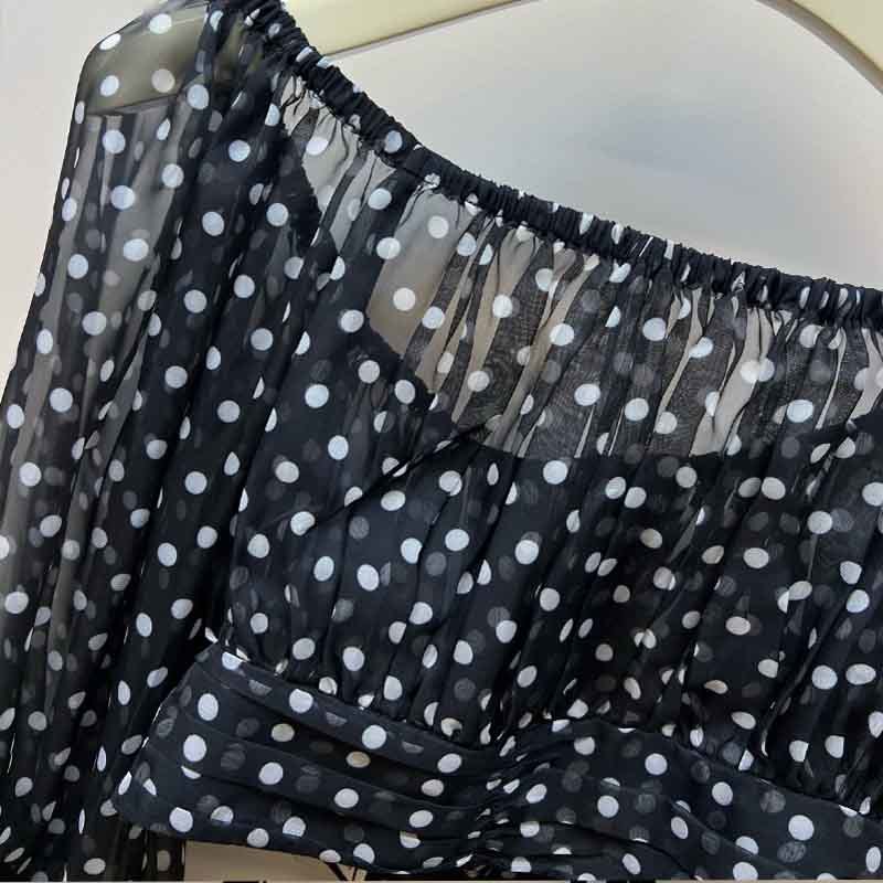 New Women Square Collar Polka Dot Off Shoulder Pullover Top Long Sleeve Lace-up Design Crop Top Fashion Streetwear Sexy Tee.A0646