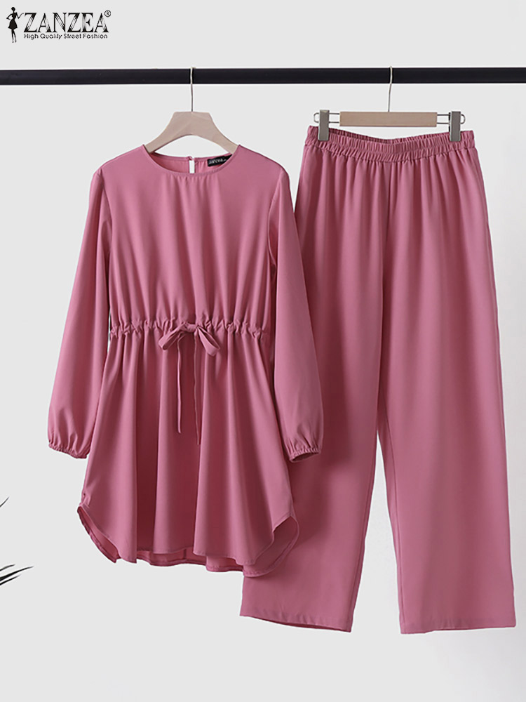 ZANZEA Woman Spring Islamic Clothing Muslim Sets Long Sleeve O-Neck Solid Blouse Wide Leg Pant Elegant Casual Loose 2PCS Suit
