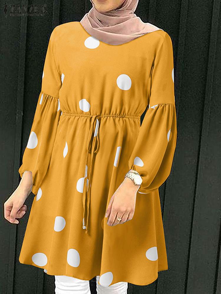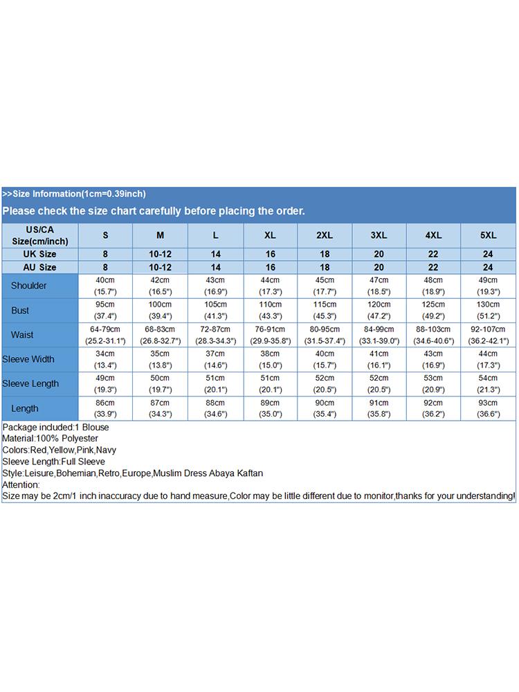 | Package included:1 Blouse Material:100% Polyester Colors:Red,Yellow,Pink,Navy Sleeve Length:Full Sleeve Neckline:O-Neck Pattern:Polka Dots printed Length:Knee Length Buckle chain:Buttons on the back Waistline:Elastic waist Thickness:Thin Decoration:Lace-Up Features:Puff Sleeve,Elastic Cuff Style:Leisure,Bohemian,Retro,Europe,Muslim Dress Abaya Kaftan Season:Spring,Summer,Autumn,Winter Occasion:Family,Party,Beach,Wedding,Holiday Attentions: 1.The Real Object May Exist Slightly Colors Differences Compared To Images As Different Computers Display.Caution If Minding,Thanks. 2.There Might Be A Manual Measuring 1-3 cm Error.Sorry For Any Inconvenience. 3.Please Prevail On Real Item, Model Images For Reference Only. 4.Attention!!!Please check the size chart carefully before placing the order.