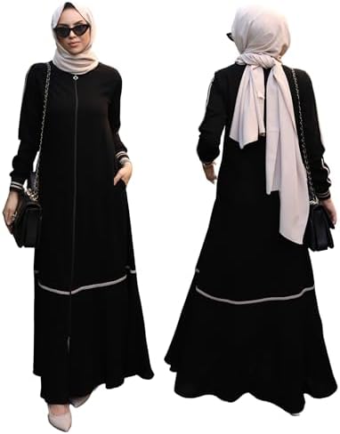 Abaya for Muslim Women Zipper and Stripe Detail on Skirt and Sleeves | Long Sleeve Dress Islamic Kaftan Hijab Robe Prayer
