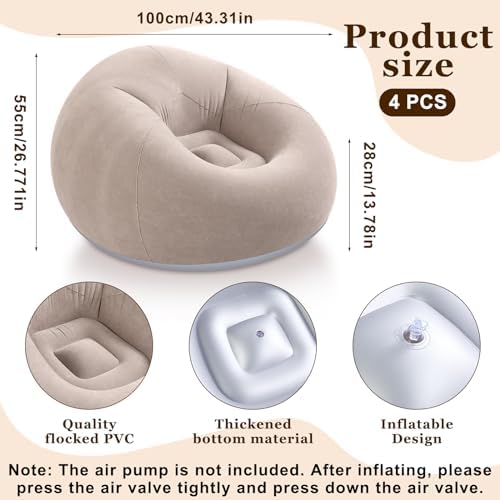 Features: Thoughtful presents: These inflatable chairs for adults are feasible to be sent as gifts to your colleagues, classmates, children, parents, relatives, neighbors and so on, making them feel your sincere thoughtfulness. Enjoy comfortable leisure: The inflatable outdoor bean bag chair is very suitable for living room, bedroom, balcony, garden, outdoor patio, camping, travel, beach, hiking, allowing you to enjoy comfortable leisure time at any time. Specifications: Material: flocked PVC Color: coffee color Size: about 43 x 43 x 34 inches/ 110 x 110 x 85 cm after being inflated Package includes: 2 x Inflatable bean bag chair Notes: Manual measurement, please allow slight errors on size. The color may exist a slight difference due to different screen displays. The air pump is not included, after inflating, please press the air valve tightly and press down the air valve