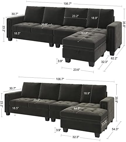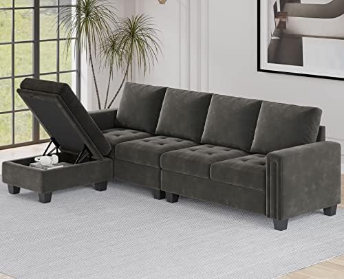 Belffin Velvet Reversible Sectional Sofa with Chaise Convertible L Shaped 4-seat Sectional Couch with Storage Ottoman Grey