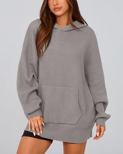 dowerme Women Oversized Sweaters 2024 Lantern Long Sleeve Drop Shoulder Chunky Knit Hooded Pullover Sweater With Pocket
