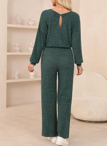 Happy Sailed Jumpsuits for Women Casual Loose Solid Ribbed Crewneck Long Sleeve Long Romper with Pockets