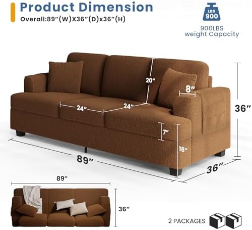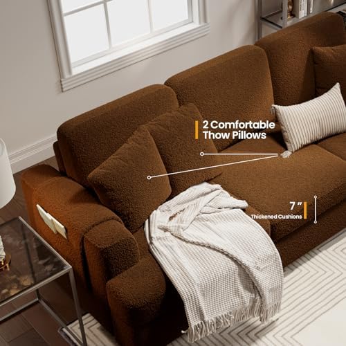 KKL Deep Seat Sofa 89" with Throw Pillow, Modern Sofa, Couches for Living Room, Comfy Sofa, Sleeper Couch, Bouclé, Brown