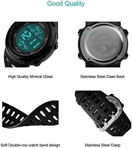Main Features: - LED digital military watch designed for men. - Equipped with alarm, day, date and stopwatch function. - Can see the time clearly in the dark with back-light. - Taiwan IC chipset, time goes precisely. - Imported PC case and highly transparent resin mirror, sturdy in structure. - PU band and highly transparent resin mirror, soft to wear. - 5ATM water resistant is convenient for daily life. - This is a good present for your relatives and friends. About Water-resistant Watches Water Resistant Watches are sealed to withstand some pressure. Water resistance is tested in measurements of atmosphere (ATM). Each ATM denotes 10 meters of static water pressure. This is not the depth to which a watch can be worn. Many watch cases will list the basic measurement of 1 ATM as "water-resistant." These watches will withstand small splashes of water but should not be worn while washing the hands or submerging the hands in water. Remember, water resistance is tested under static conditions. Wearing a watch which is 50 metres water resistant to water will expose the watch to a much greater pressure than during a 50-metre static test. Therefore the number of metres shown on the watch does not indicate the depth that the watch can be taken to. Here is a general guide 50M = 5ATM = Shower Proof - it's ok to get it wet a bit. 100M = 10ATM = Extended Water Exposure good for swimming or snorkeling. 200M = 20ATM = Pressure Resistant made for Scuba and Skin Diving.