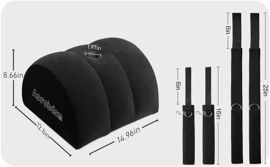 Well, please let me stat by saying THANK YOU!!!!!!!!!! This BDSM pillow with handcuffs to used for leg or wrist restraint. There’s a DILDO MOUNT. ,wooooohooooo , again THANK YOU. I love that it’s inflatable and easy to take with me whenever or wherever I want. It’s made of soft skin friendly material. The restraints are made for comfort not damage. It cleans up easy too.