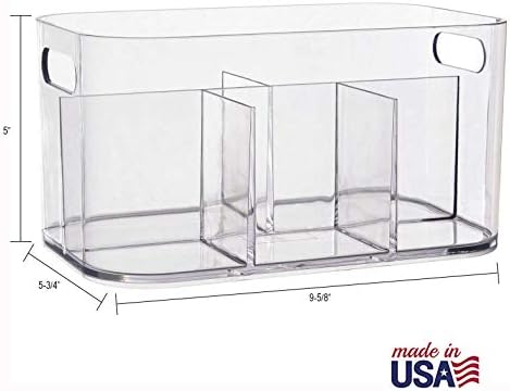 Clear deep plastic storage bin contains your daily essentials in one location. The modern shape fits well in bathroom drawers or under the kitchen sink. Store bottles, brushes, and cotton balls in deep bathroom drawers. Also great for holding sponges, gloves, towels, and other cleaning supplies. Use in craft rooms or offices to organize markers, pens, and pencils. This clear open-top organizer with pass-through handles is proudly made in the USA and cleans easily with mild soap and warm water.