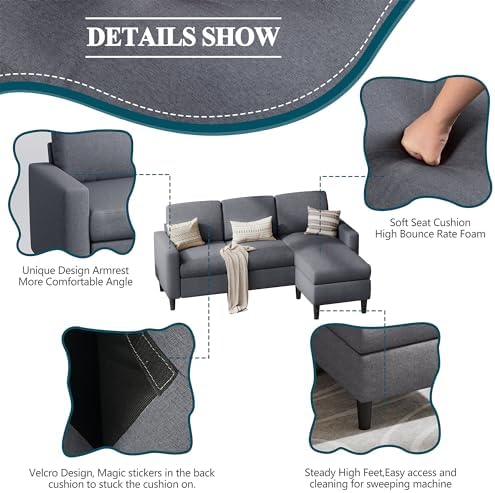 SUNLEI L-Shaped Couch Sofa for Living Room Convertible Sectional Sofa with Reversible Chaise Modern Linen Fabric,Sectional Sofa Couch for Small Space(Dark Grey)