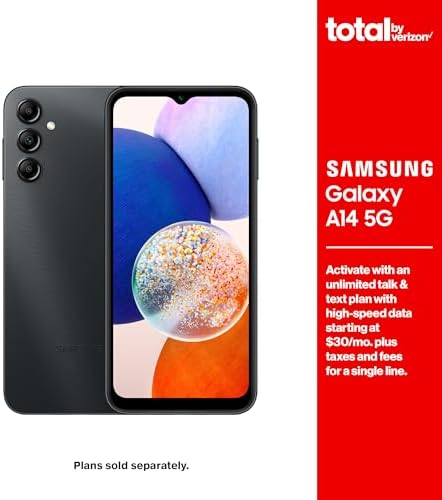 Keep up with life with your fast paced life with a phone that fits you, like the Samsung Galaxy A14 5G from Total by Verizon. Explore new wireless heights and see your favorite content come to life on large, edge-to-edge high definition screen. With the speed of 5G and a powerful Galaxy processor, you can experience you day virtually lag-free. Focus more on living and less on charging with long-lasting battery life. Upgrade your selfie game with a sharp 13MP front-camera, plus a triple-lens back-camera system that makes capturing high-res content a breeze. The Samsung Galaxy A14 5G has 64 GB storage expandable to 1T perfect for keeping all your favorite memories, content, and more all in one place.Get a premium wireless experience without the premium price tag or costly long-term contracts with high-speed data and Unlimited talk & text plans from Total by Verizon that start at just $30/mo plus taxes and fees for a single line. 5G access requires a 5G-capable device in a 5G coverage area.