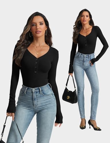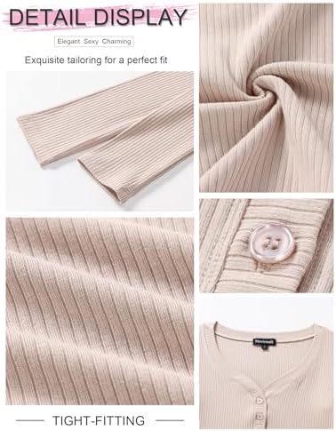 Women's Long Sleeve V Neck Shirt Sexy Henley Slim Fit Tight Going Out Top Ribbed Knit Button Fall Shirt 2024